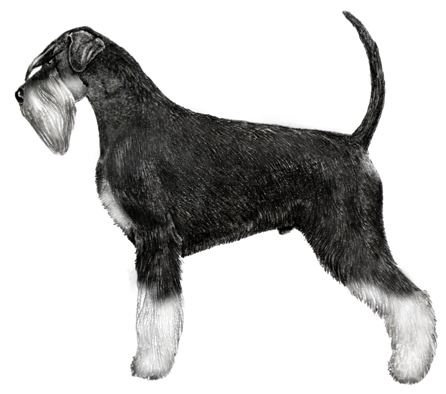 Pepper and salt: Shades range from dark iron grey to light grey; hairs banded black/light/black. Dark facial mask essential, harmonising with corresponding body colour.